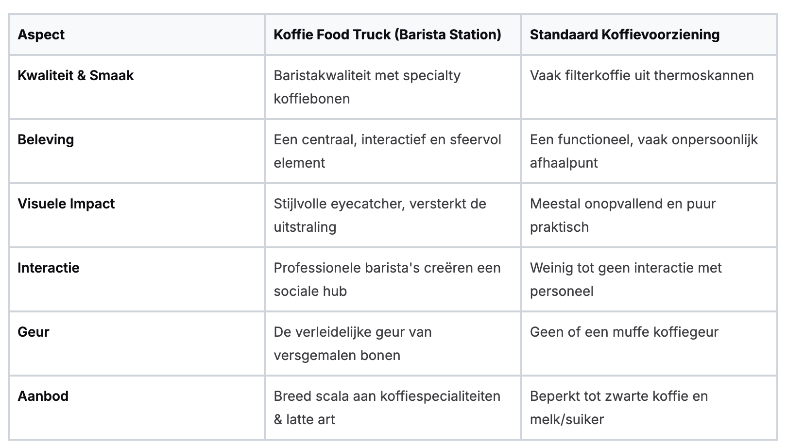 Om de voordelen concreet te maken, hebben we de verschillen tussen een professionele mobiele koffiebar en een traditionele oplossing op een rijtje gezet. De tabel hieronder spreekt voor zich.
