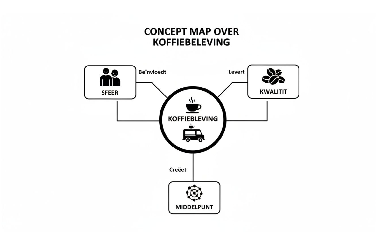 Deze conceptmap laat perfect zien hoe een koffie food truck de beleving opbouwt rond drie kernelementen: de sfeer, de kwaliteit van het product en de rol als sociaal middelpunt.