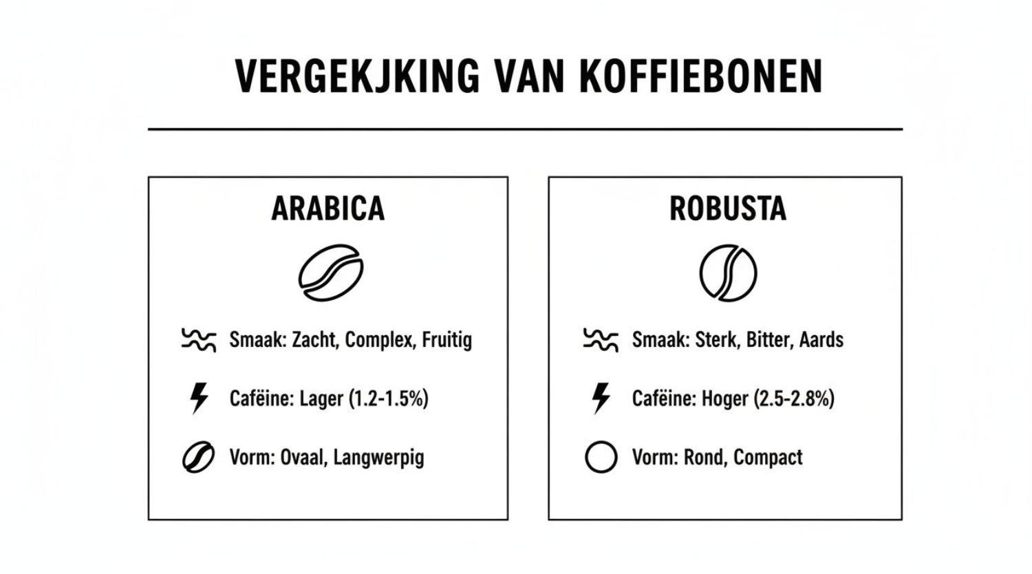 Een directe vergelijking van de belangrijkste eigenschappen van Arabica- en Robusta-koffiebonen.