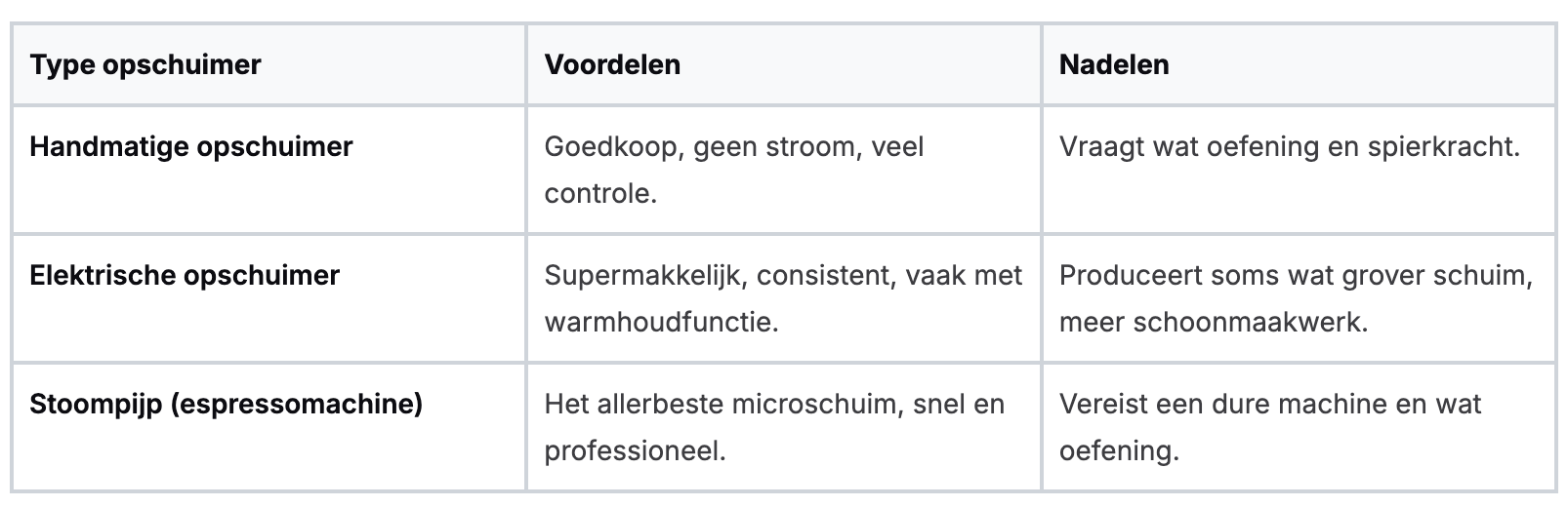 Niets verslaat de stoompijp van een professionele espressomachine, zoals wij die bij Barista Station gebruiken. Daarmee creëer je dat perfecte, glanzende microschuim dat essentieel is voor latte art en dat luxueuze gevoel in je mond. Voor thuis is een goede elektrische opschuimer een fantastisch en gebruiksvriendelijk alternatief.