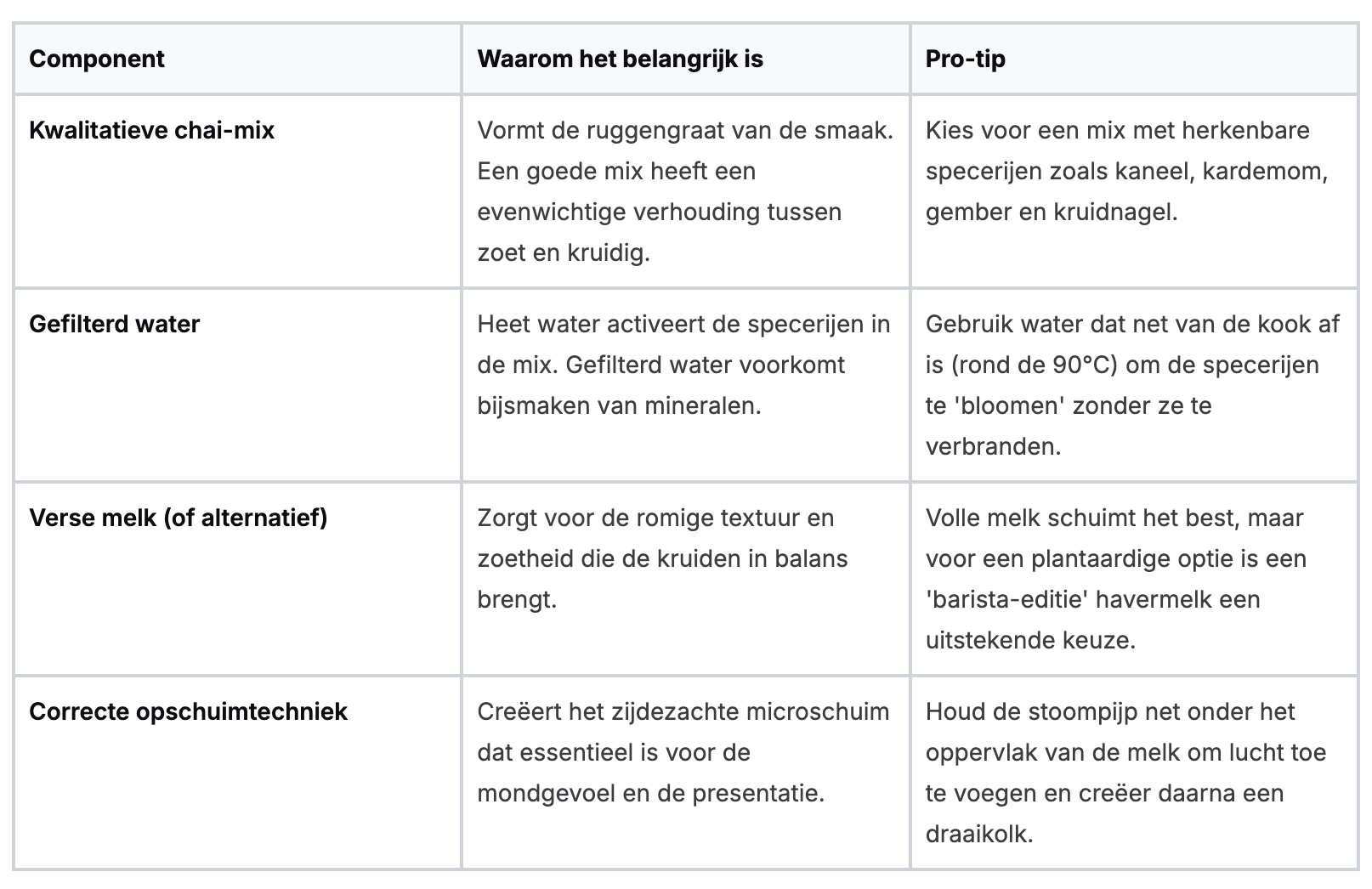Om te begrijpen hoe je een chai latte maakt als een pro, is het handig om de belangrijkste bouwstenen en hun functie te kennen. Elk element speelt een sleutelrol in het eindresultaat.
