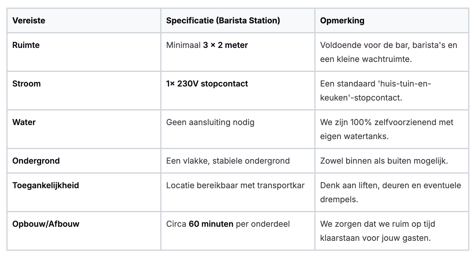 Hieronder vind je een overzicht van de belangrijkste praktische vereisten voor het plaatsen van een mobiel baristastation op jouw evenementlocatie in Rotterdam.