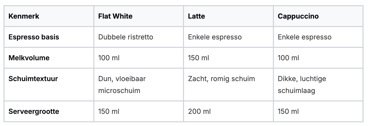 De afbeelding laat het duidelijk zien: de flat white heeft de dunste schuimlaag, waardoor de intense smaak van de espresso de boventoon voert.